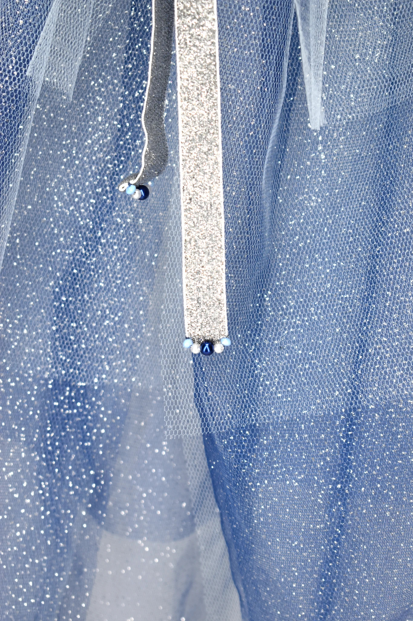 Tul con glitter azul marino, tul comun celeste, tul con glitter azul marino, tul comun celeste, tul comun celeste, y una capa de tul con glitter azul marino.