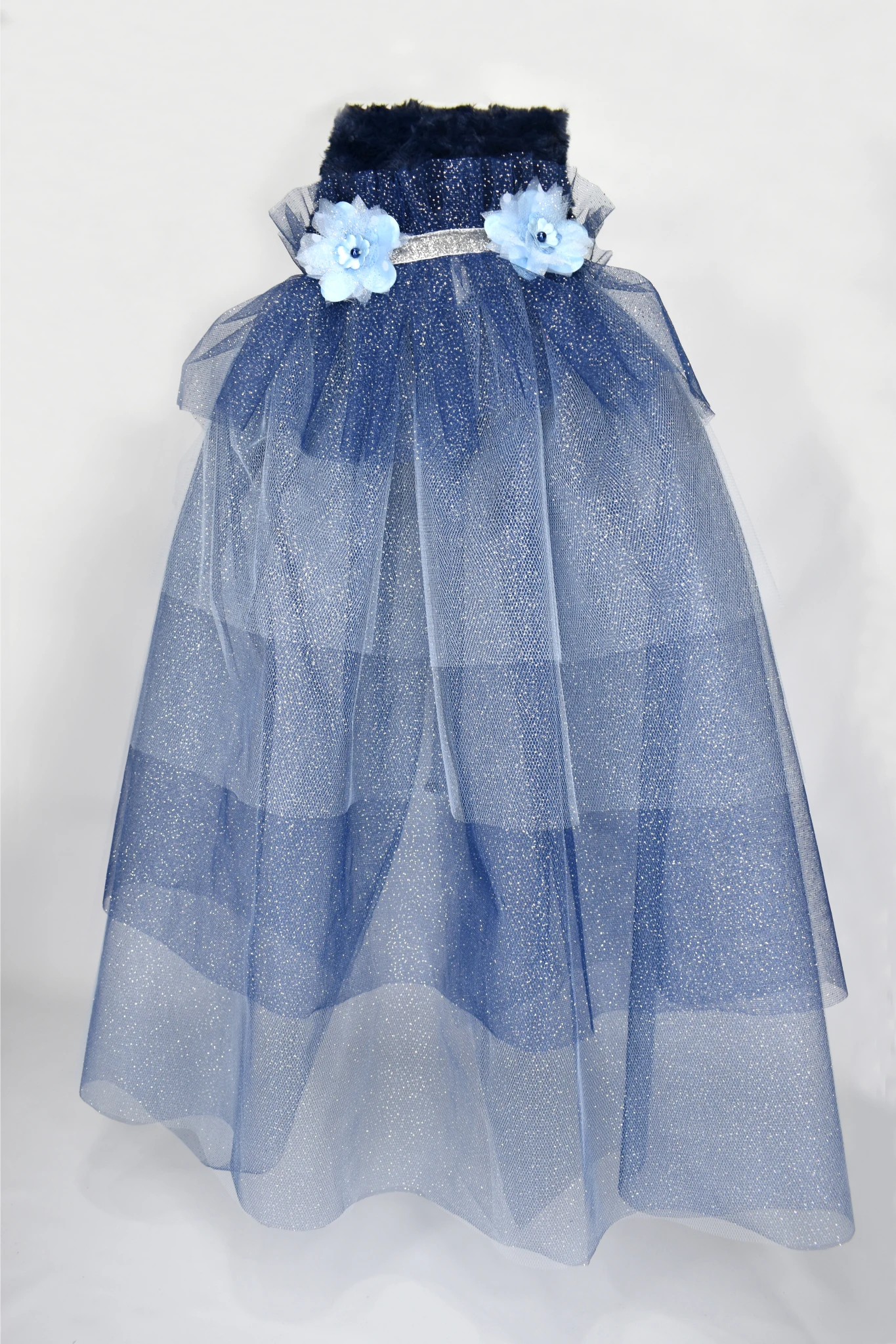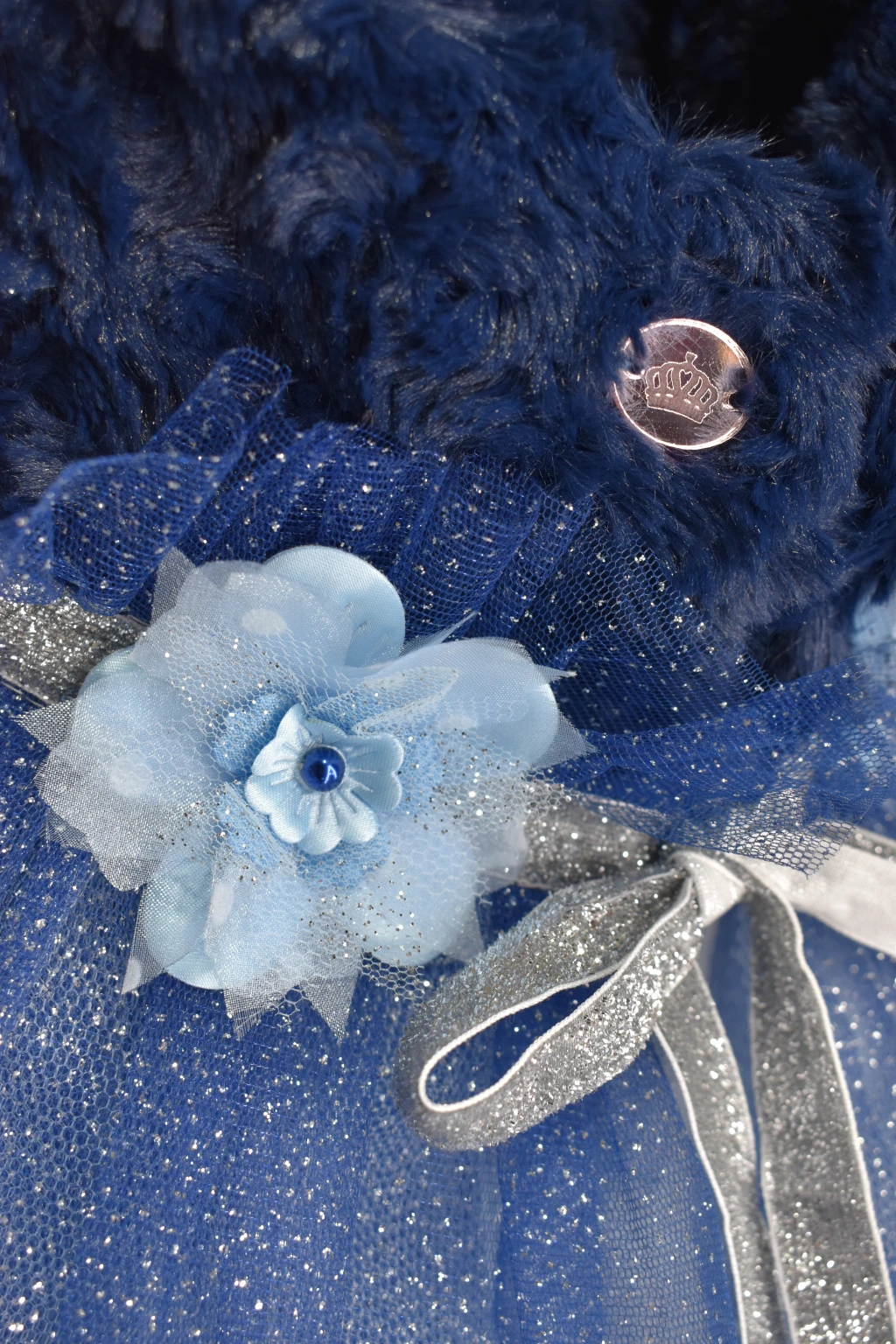 Capa realizada con cuello de piel sintetica de rosetas en color azul marino. Hacia abajo se encuentran las siguientes capas de tela: