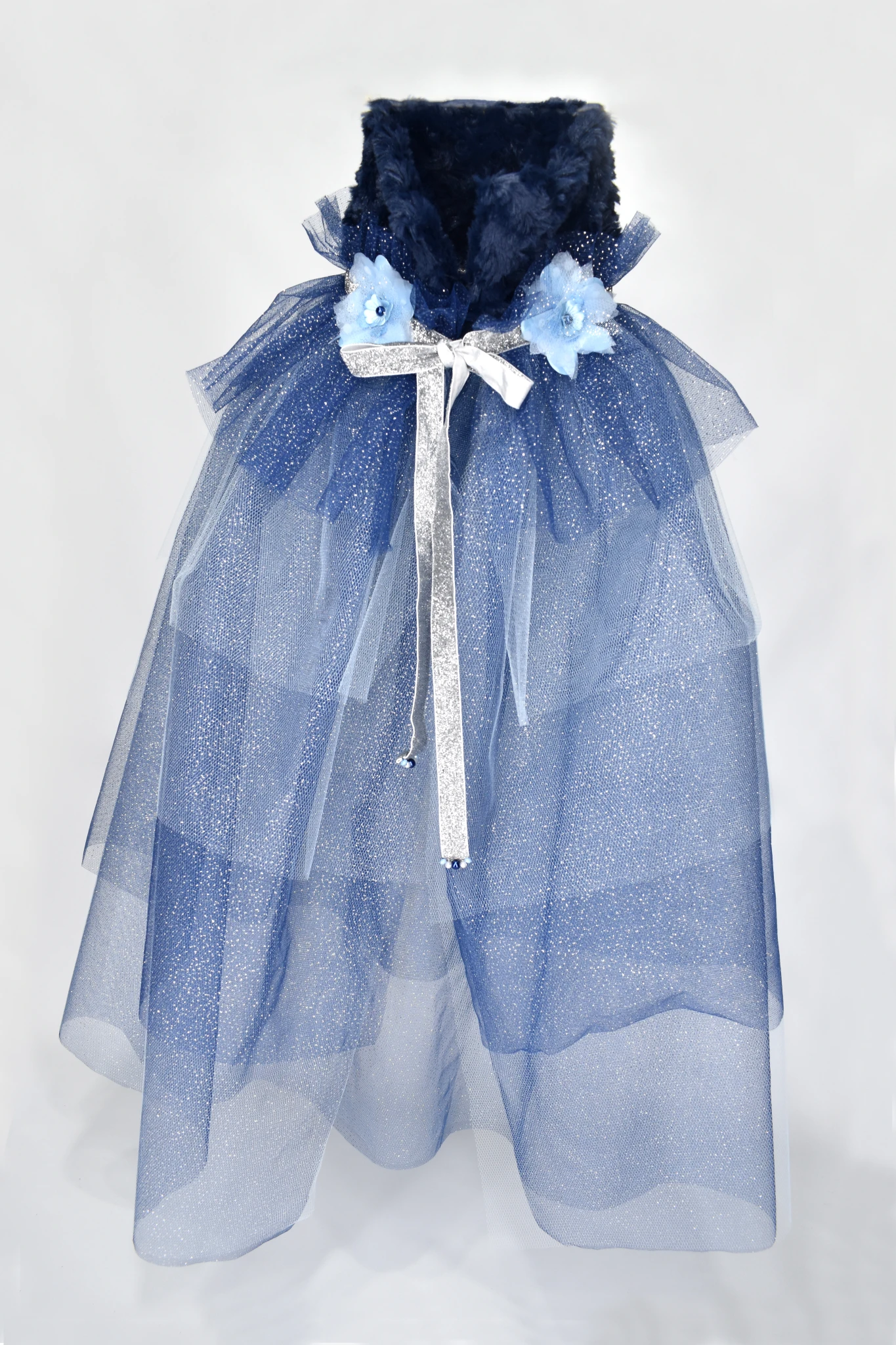 Entre el cuello y cuerpo de la capa posee cuatro flores realizadas artesanalmente con los textiles de los vestidos azules: organza flockeada con motas pequeñas en color celeste, tul comun celeste, tul con glitter celeste y una perla en azul marino.