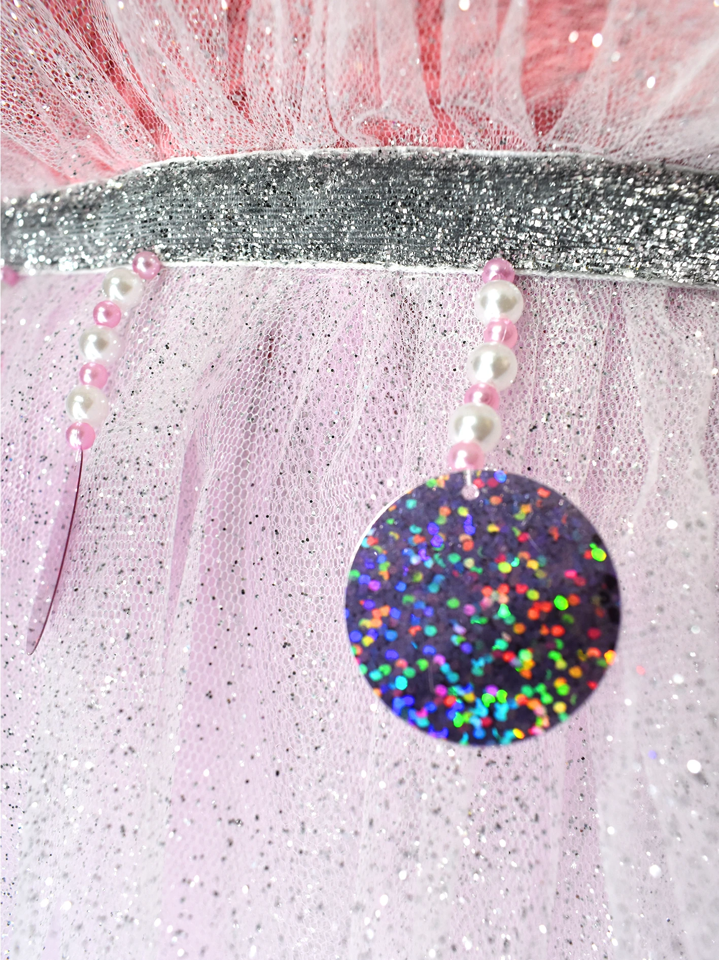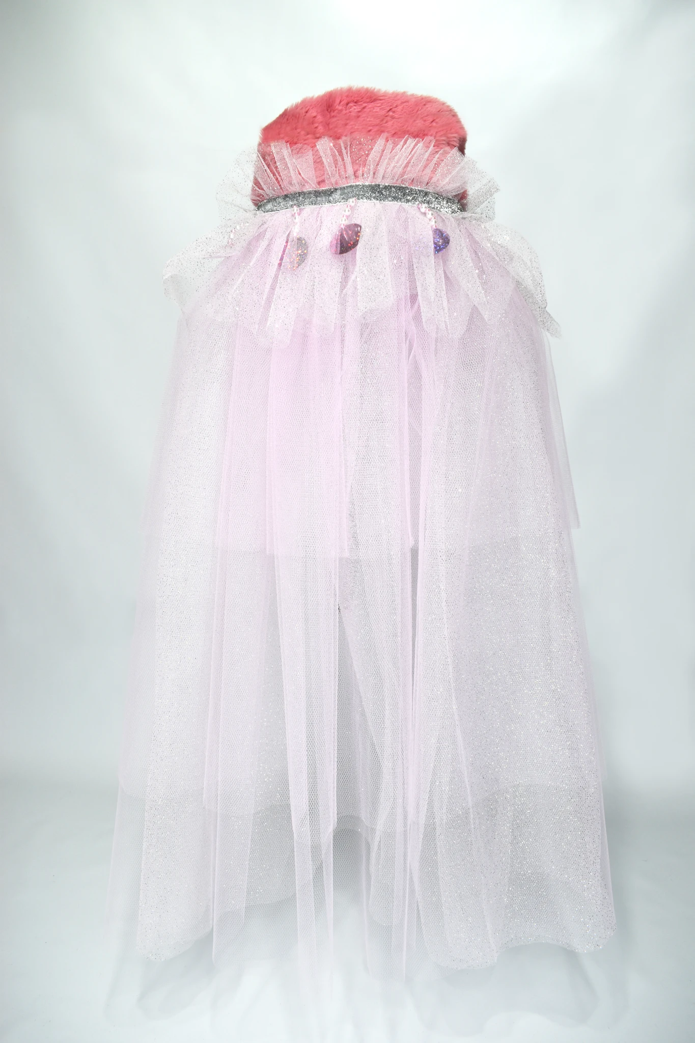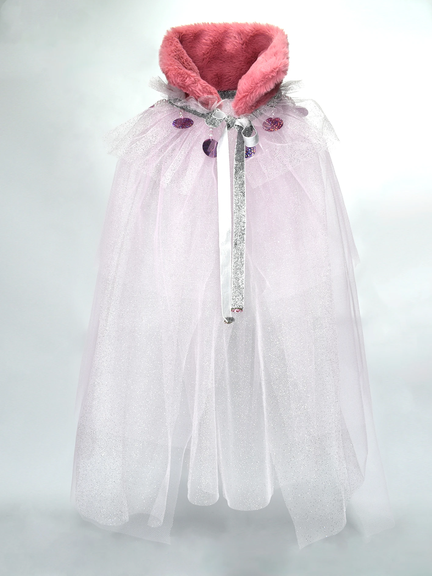 Entre el cuello y cuerpo de la capa posee nueve colgantes de perlas plasticas que terminan en un lentejuelon rosa.