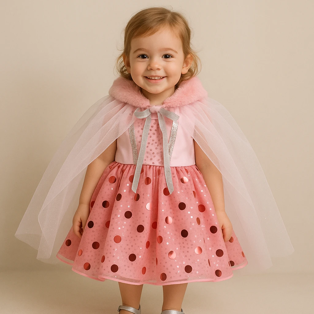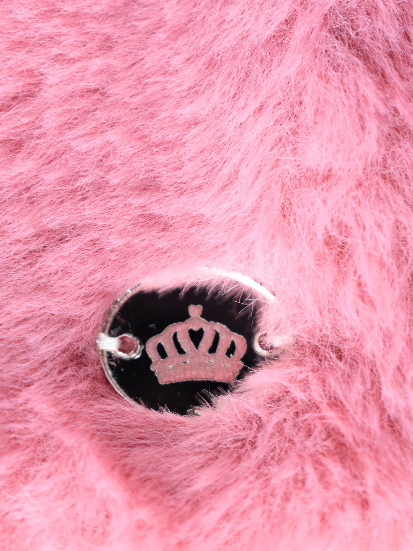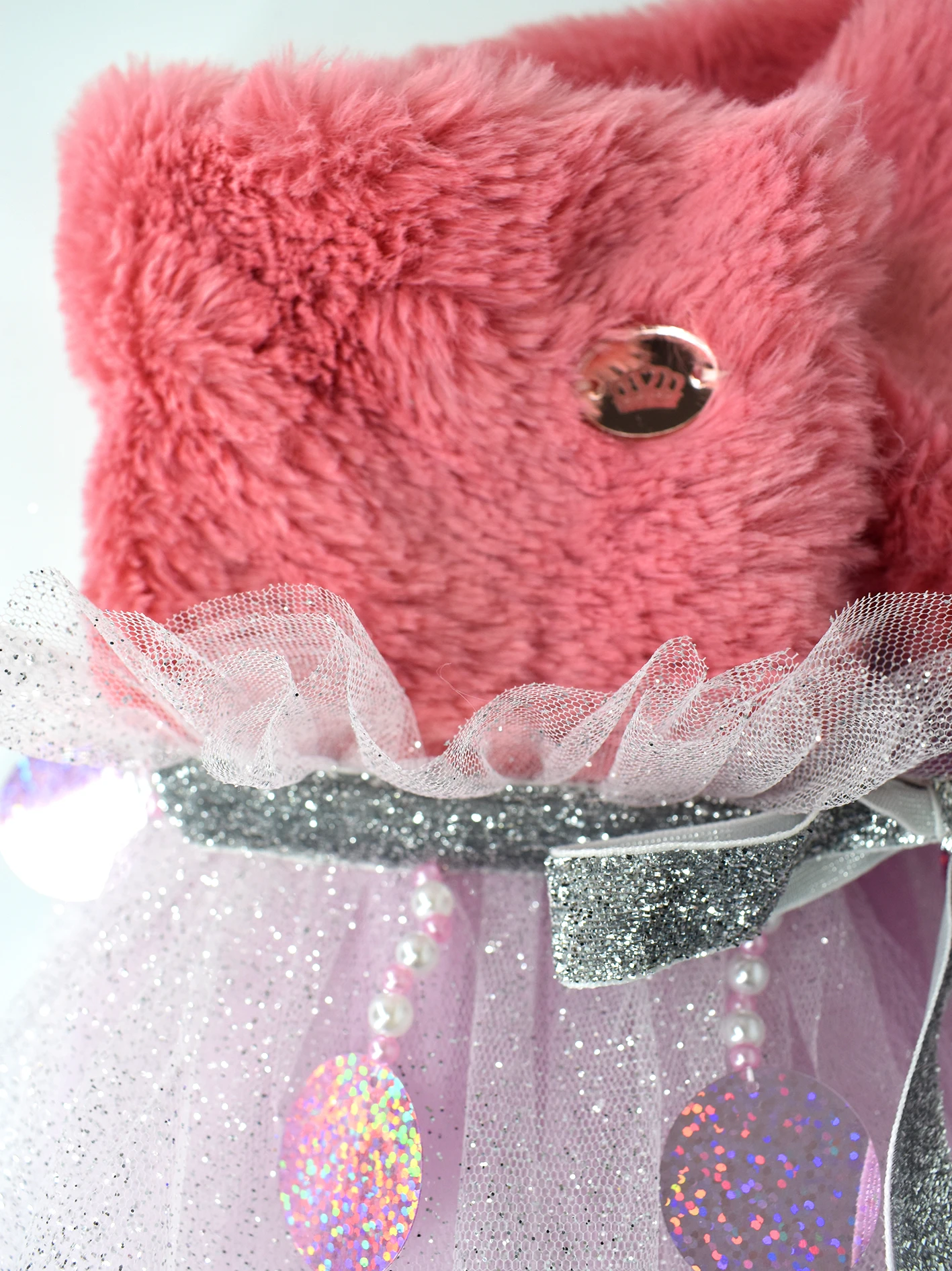 Entre el cuello y cuerpo de la capa posee nueve colgantes de perlas plasticas que terminan en un lentejuelon rosa.