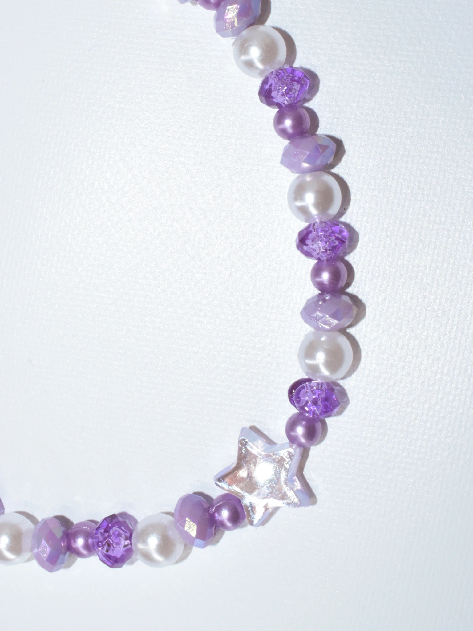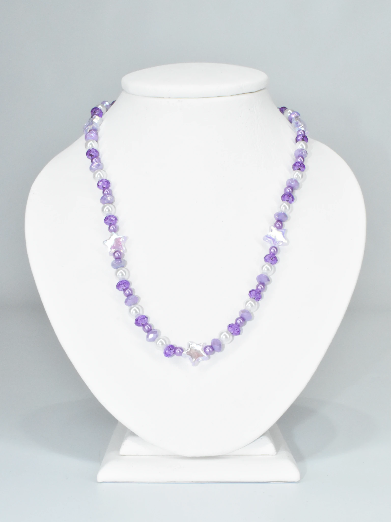 Este collar tiene el encanto de los atardeceres y el misterio de lo sutil, combina cuentas ovaladas violetas brillantes y facetadas, perlas redondas blancas, perlitas redondas violetas, cuentas ovaladas lilas facetadas, y cuentas en forma de estrellas violetas translucidas. Todas las cuentas son brillantes como una noche estrellada.