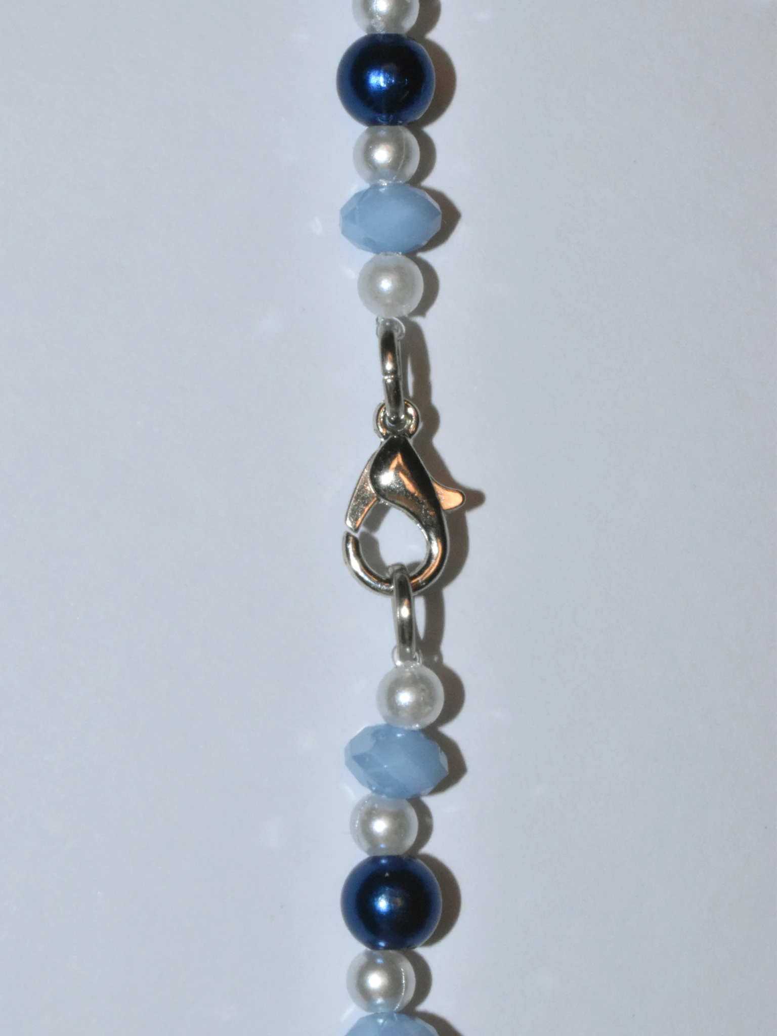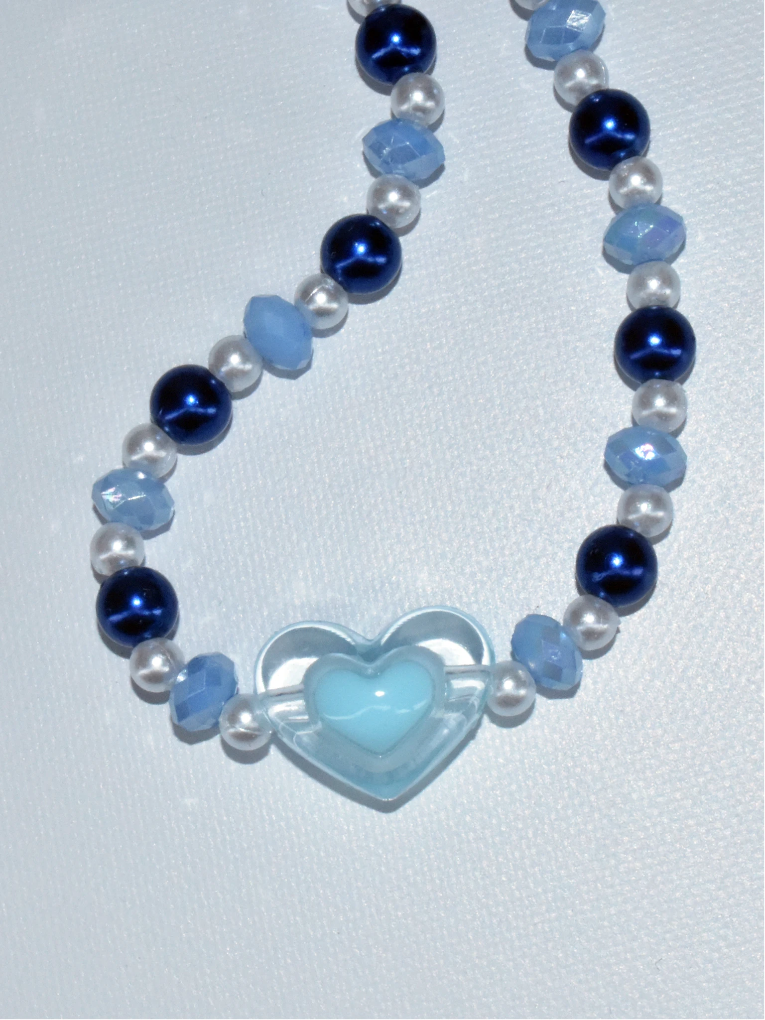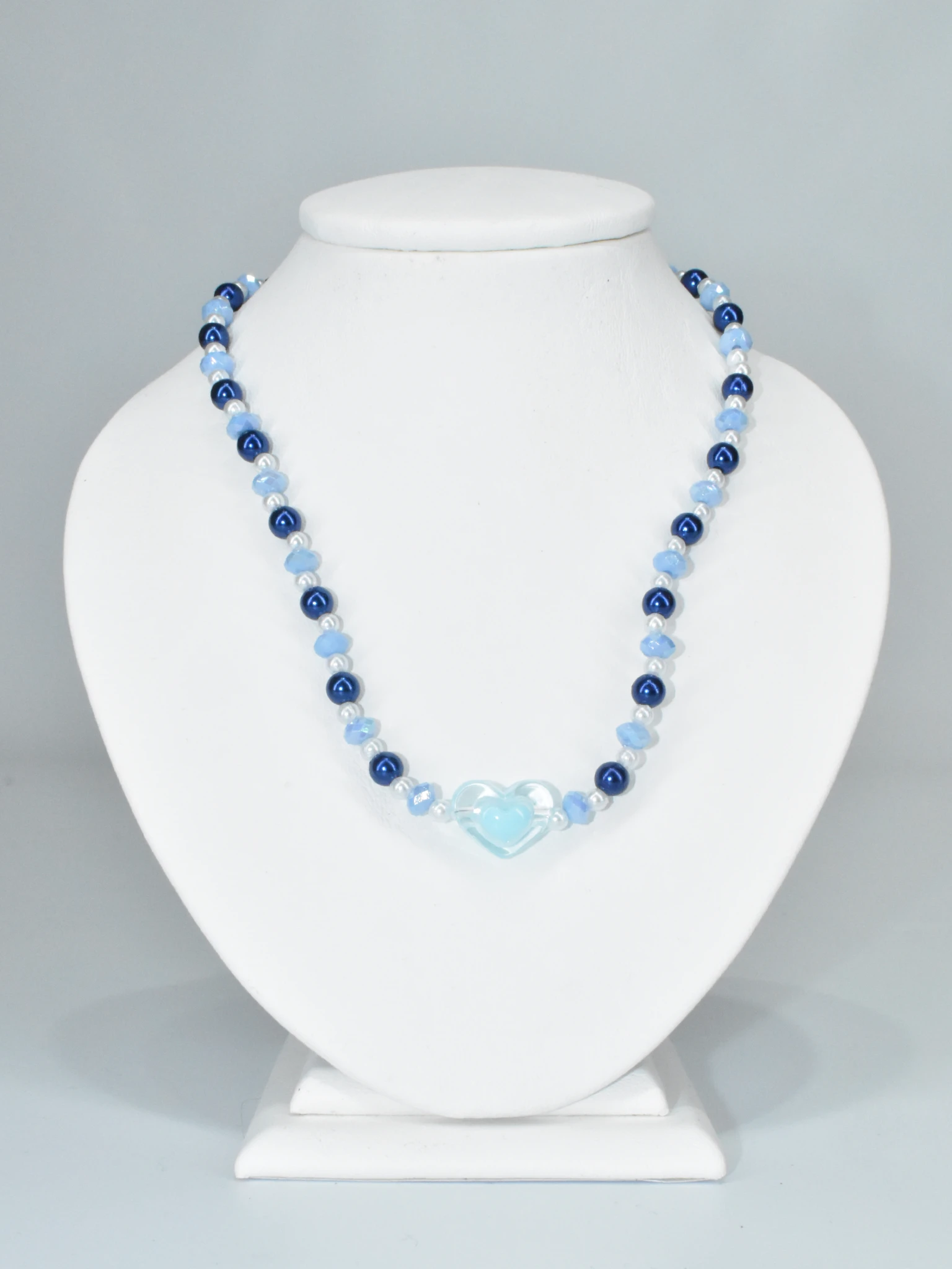 Para pequeñas romanticas este collar que parece hecho de gotas de cielo y nubes esponjosas, lleva cuentas ovaladas celestes brillantes y facetadas, perlas redondas azul marino, perlitas redondas blancas, y en el centro un corazon de acrilico transparente con un corazon mas pequeño y celeste dentro. Todas las cuentas son brillantes como una noche estrellada.