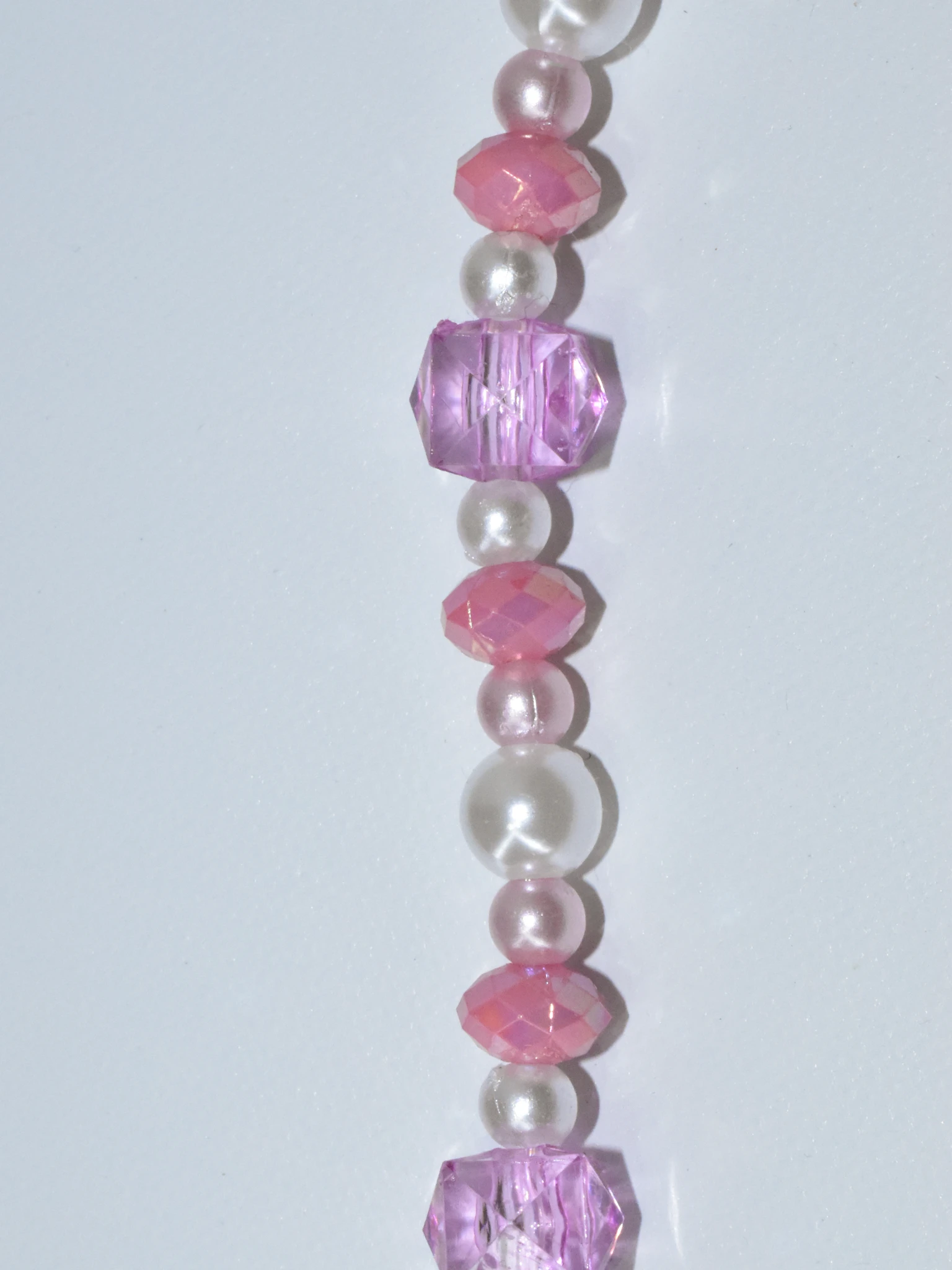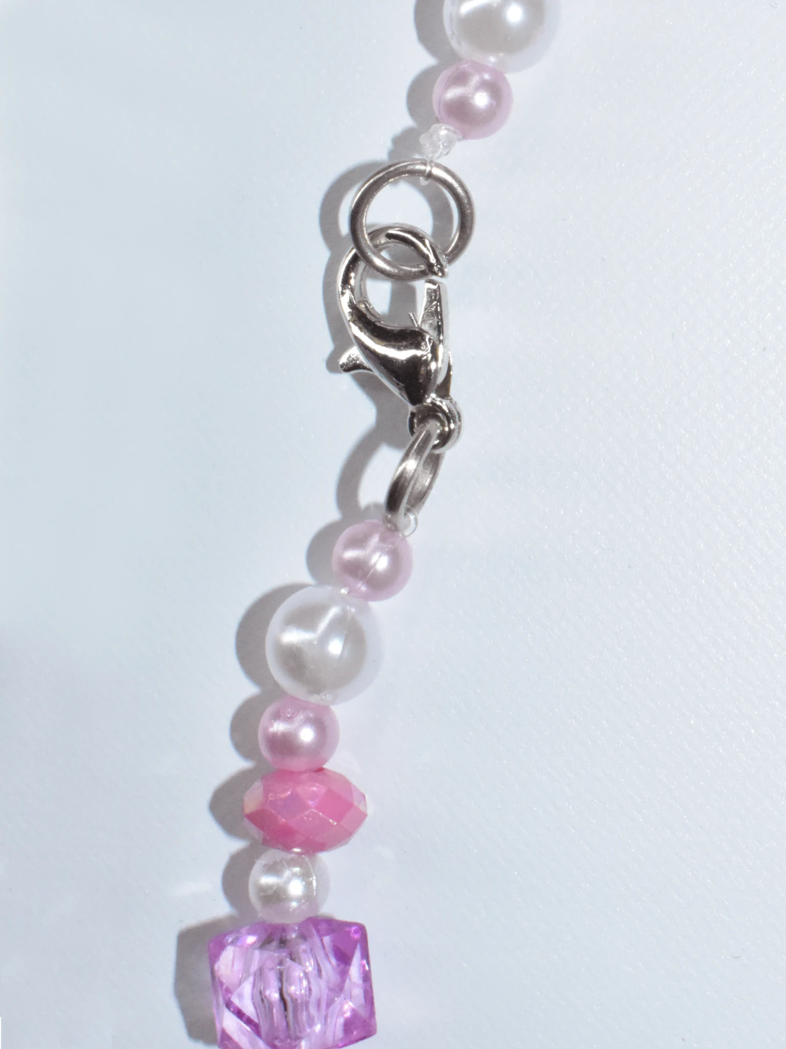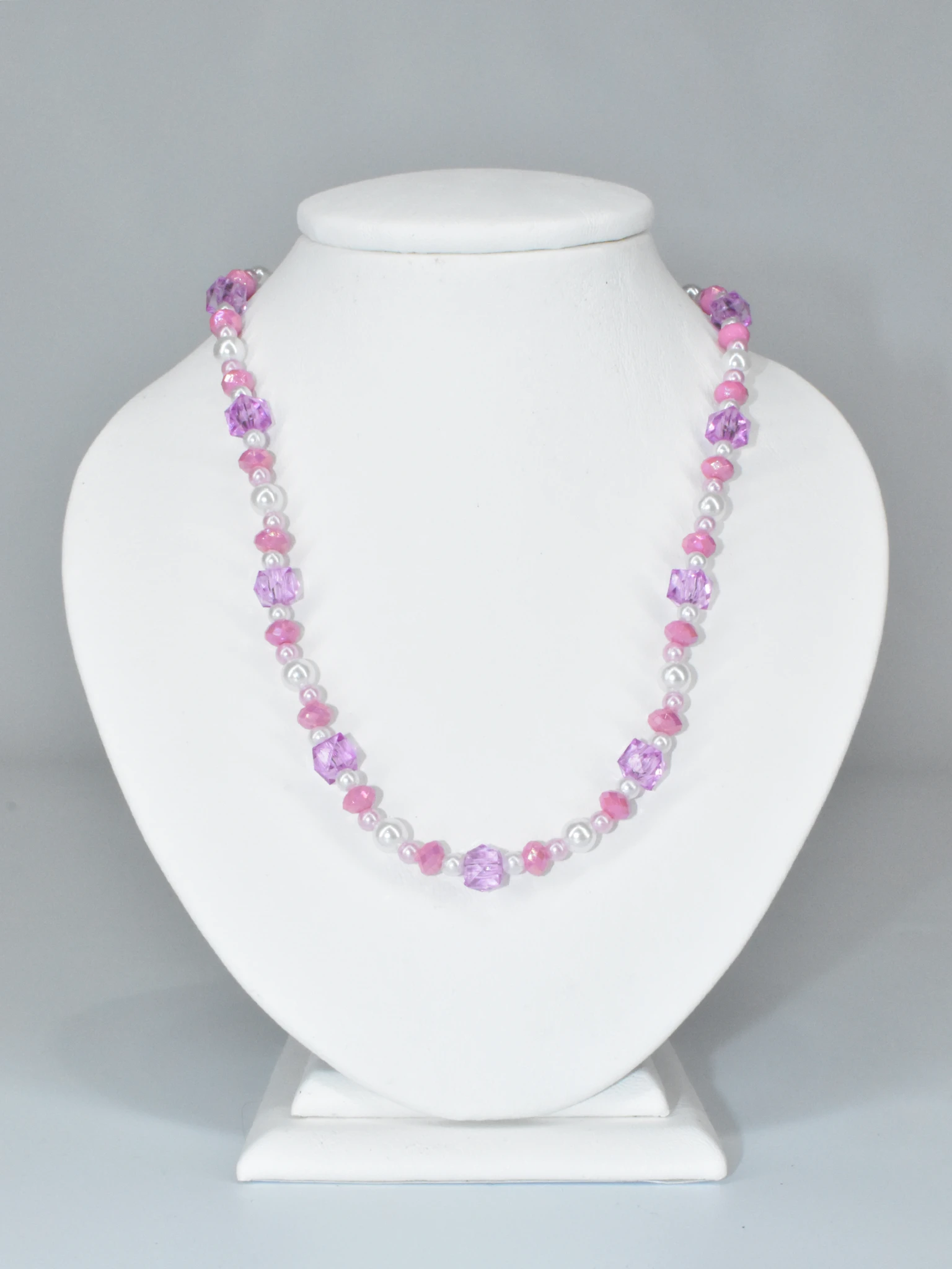 Combinando tonos y texturas que despiertan la curiosidad, este collar lleva cuentas ovaladas rosa brillantes y facetadas, perlas redondas blancas, perlitas redondas rosas, y cuentas en forma de cubo rosas translucidas y facetadas. Todas las cuentas son brillantes como una noche estrellada.