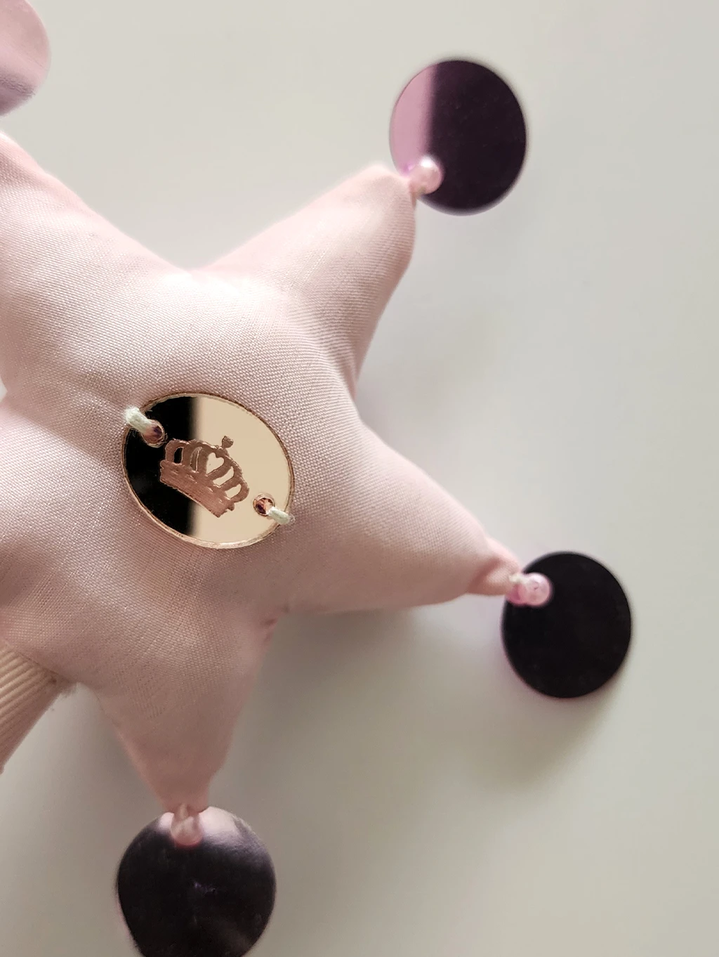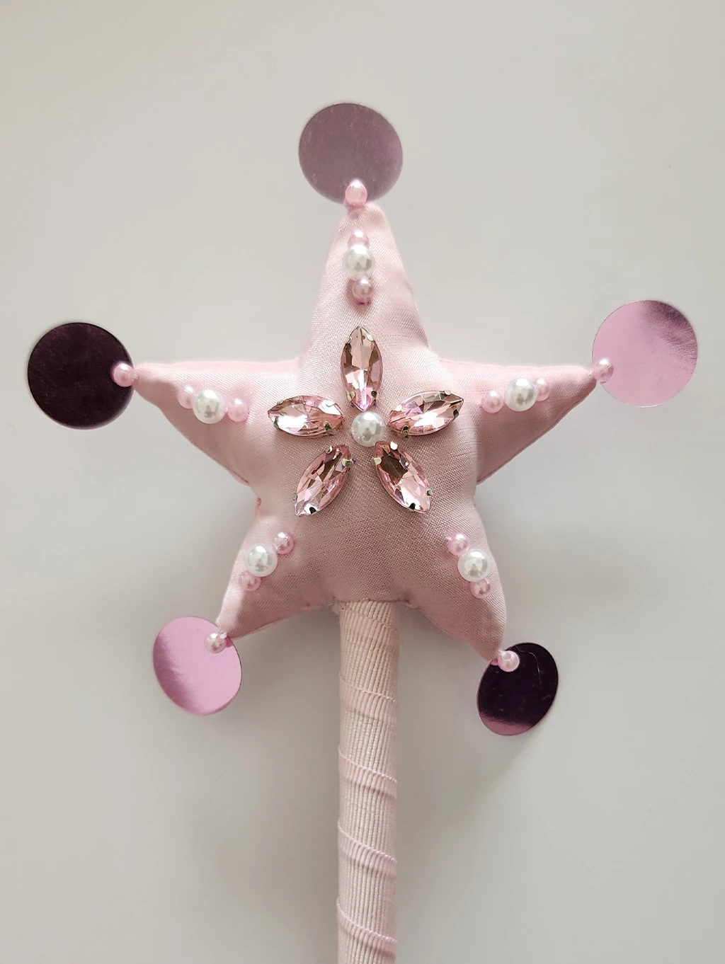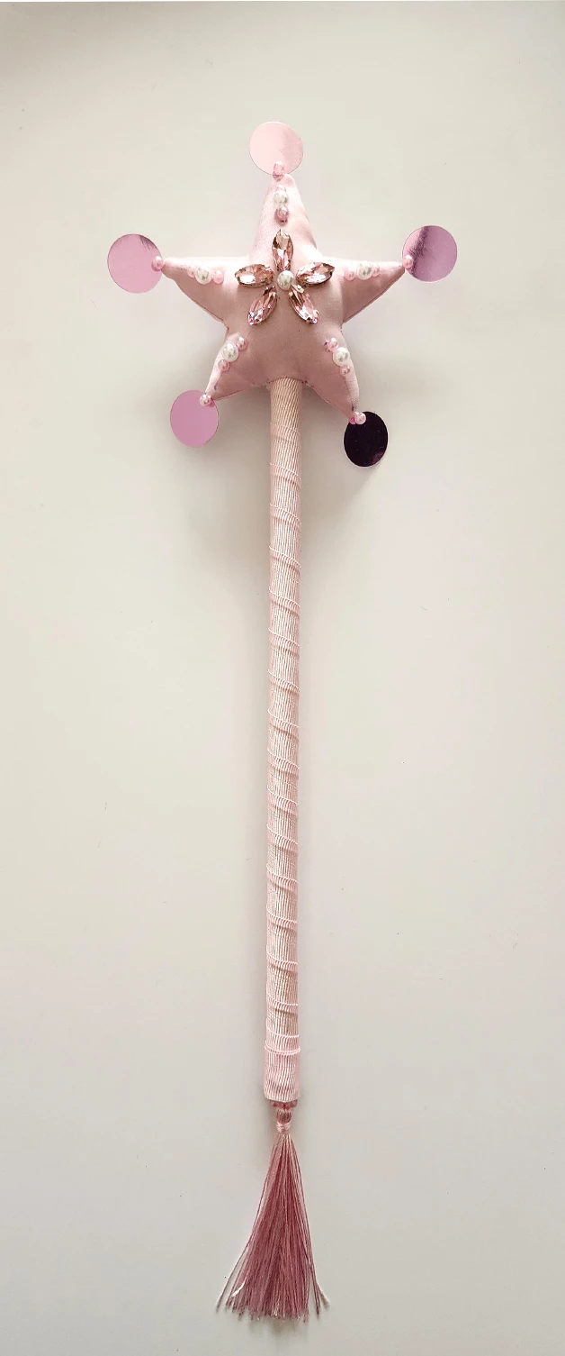 Varita realizada en creppe de seda en color rosa y forma de estrella, la cual lleva bordado artesanal de gemas engarzadas y perlas plasticas. Los picos finalizan con lentejuelas a tono. En la parte posterior de la estrella se encuentra el dije de acrilico grabado con logotipo de la marca. La varilla es de madera de pino con revestimiento de cinta gross color rosa. Finaliza en una borla a tono.