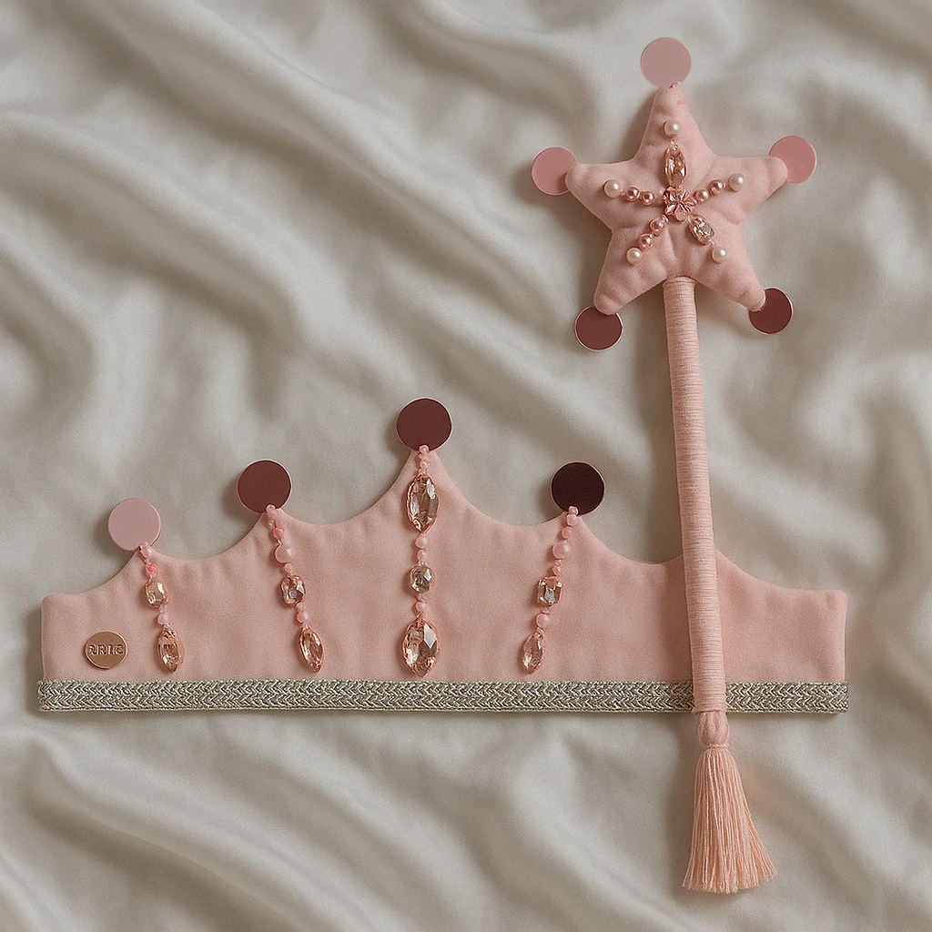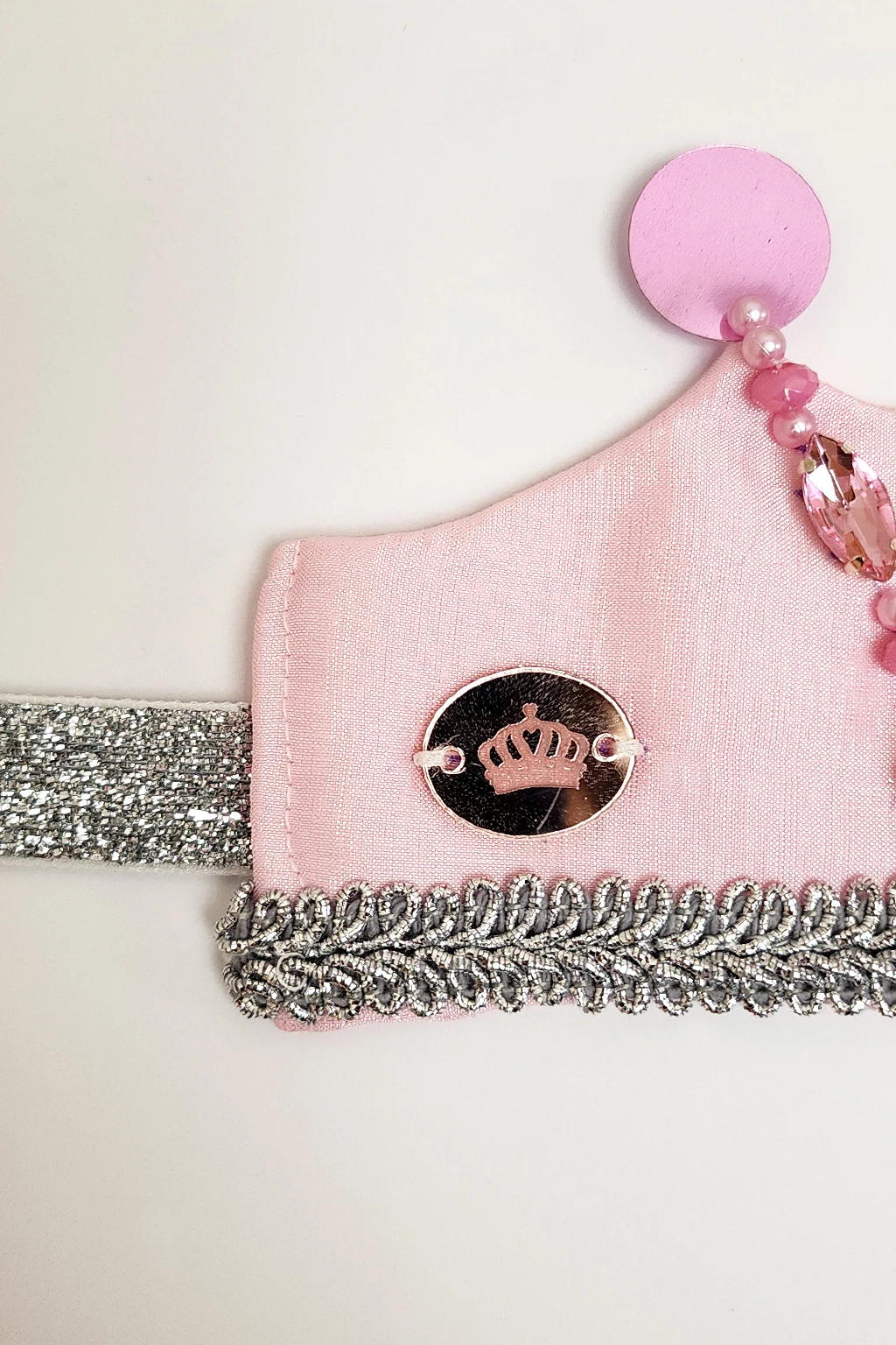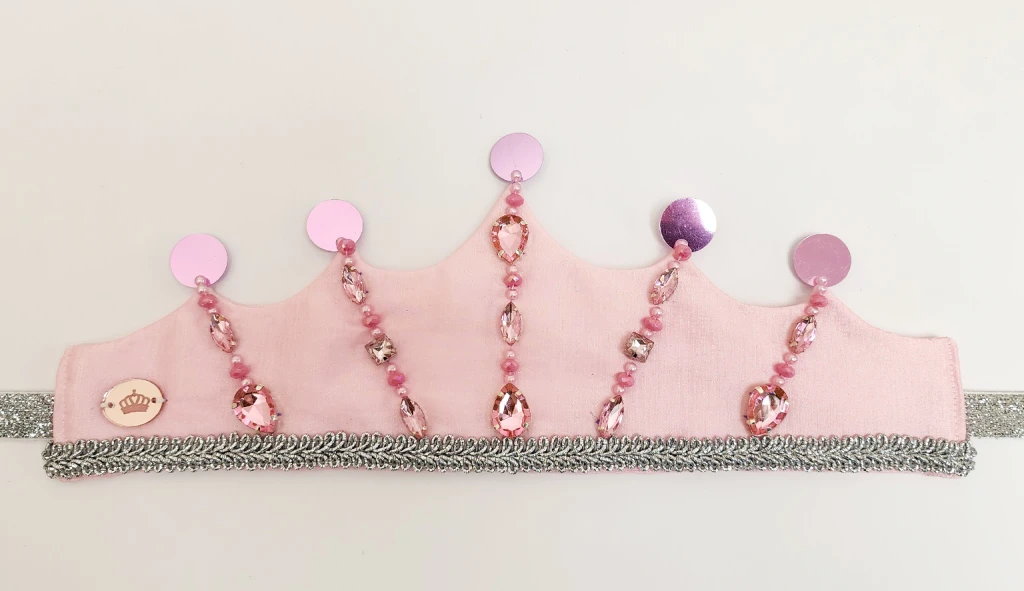 Corona realizada en creppe de seda en color rosa con bordado artesanal de gemas engarzadas y perlas plasticas. Los picos finalizan con lentejuelas a tono. En la parte inferior posee un galon plateado en todo el largo de la corona y para finalizar en sus laterales se encuentran las dos cintas de lurex plateadp que sirven para ajustar la corona a la cabeza de las princesas. En lateral se encuentra el dije de acrilico grabado con logotipo de la marca.