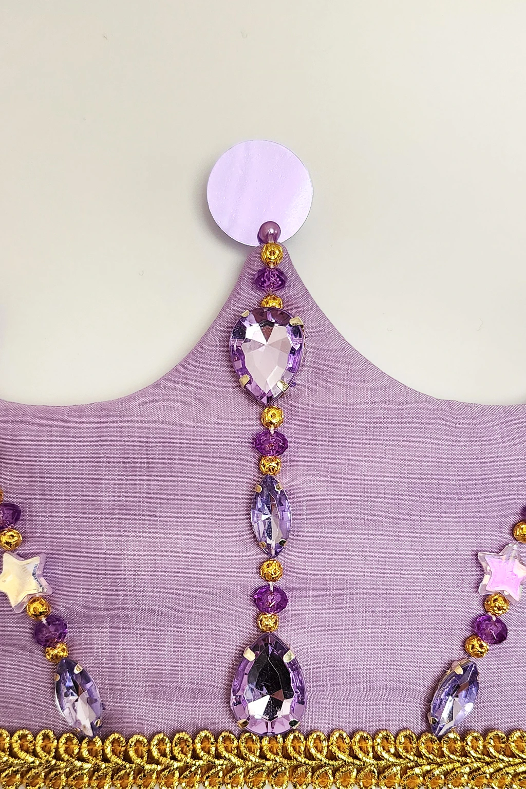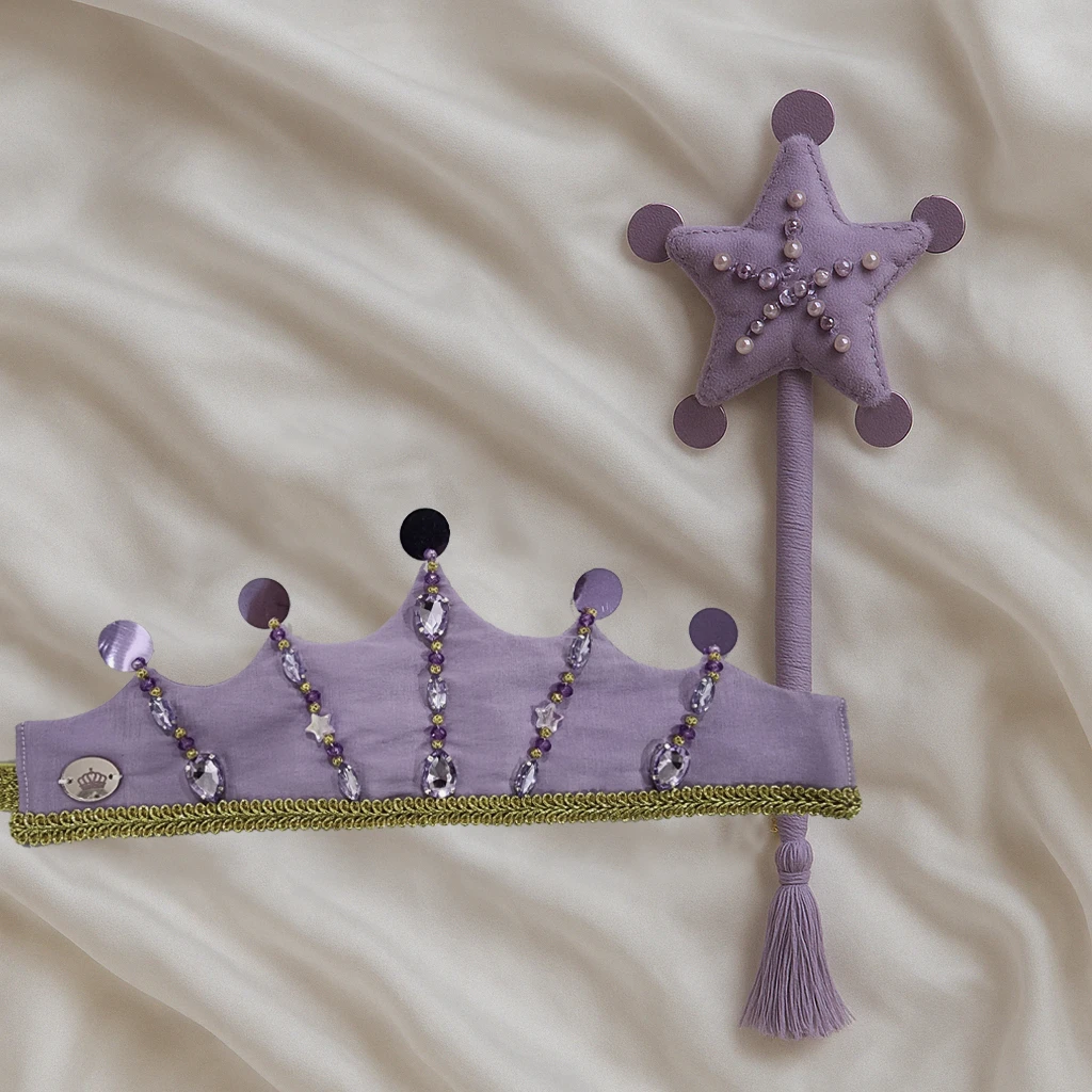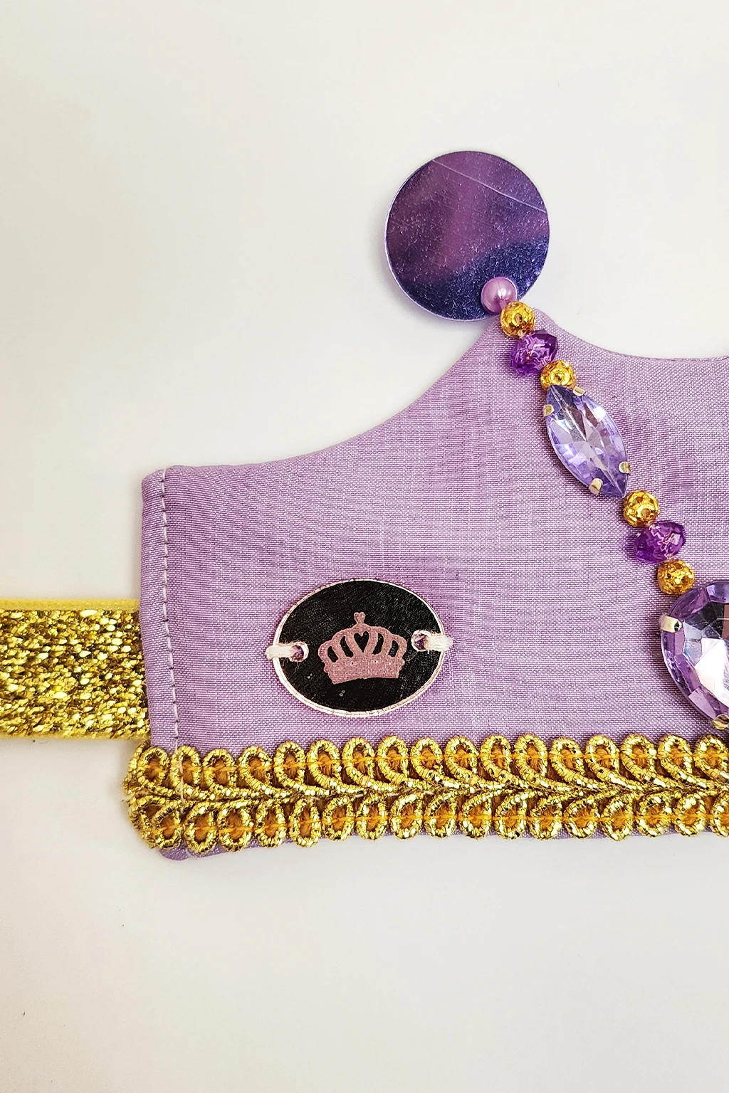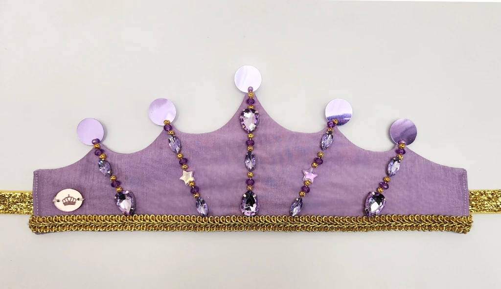 Corona realizada en creppe de seda en color lila con bordado artesanal de gemas engarzadas y perlas plasticas. Los picos finalizan con lentejuelas a tono. En la parte inferior posee un galon dorado en todo el largo de la corona y para finalizar en sus laterales se encuentran las dos cintas de lurex dorado que sirven para ajustar la corona a la cabeza de las princesas. En lateral se encuentra el dije de acrilico grabado con logotipo de la marca