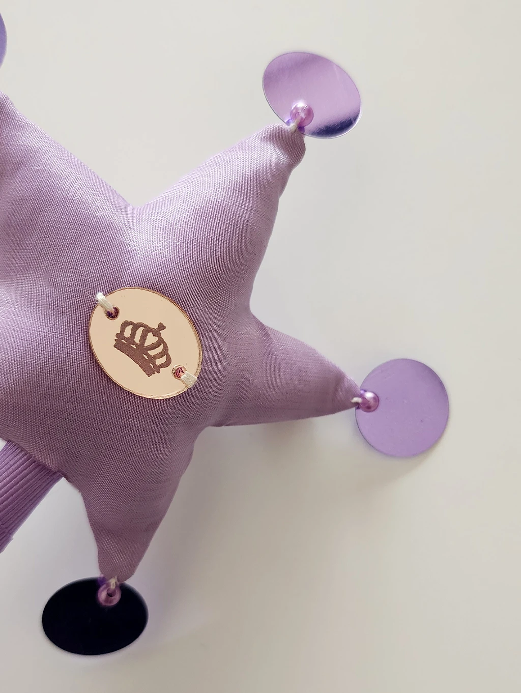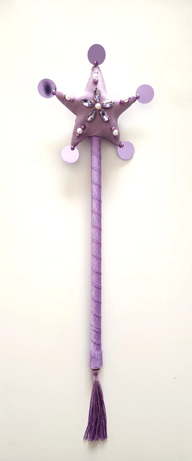 Varita realizada en creppe de seda en color lila y forma de estrella, la cual lleva bordado artesanal de gemas engarzadas y perlas plasticas. Los picos finalizan con lentejuelas a tono. En la parte posterior de la estrella se encuentra el dije de acrilico grabado con logotipo de la marca. La varilla es de madera de pino con revestimiento de cinta gross color lila. Finaliza en una borla a tono.