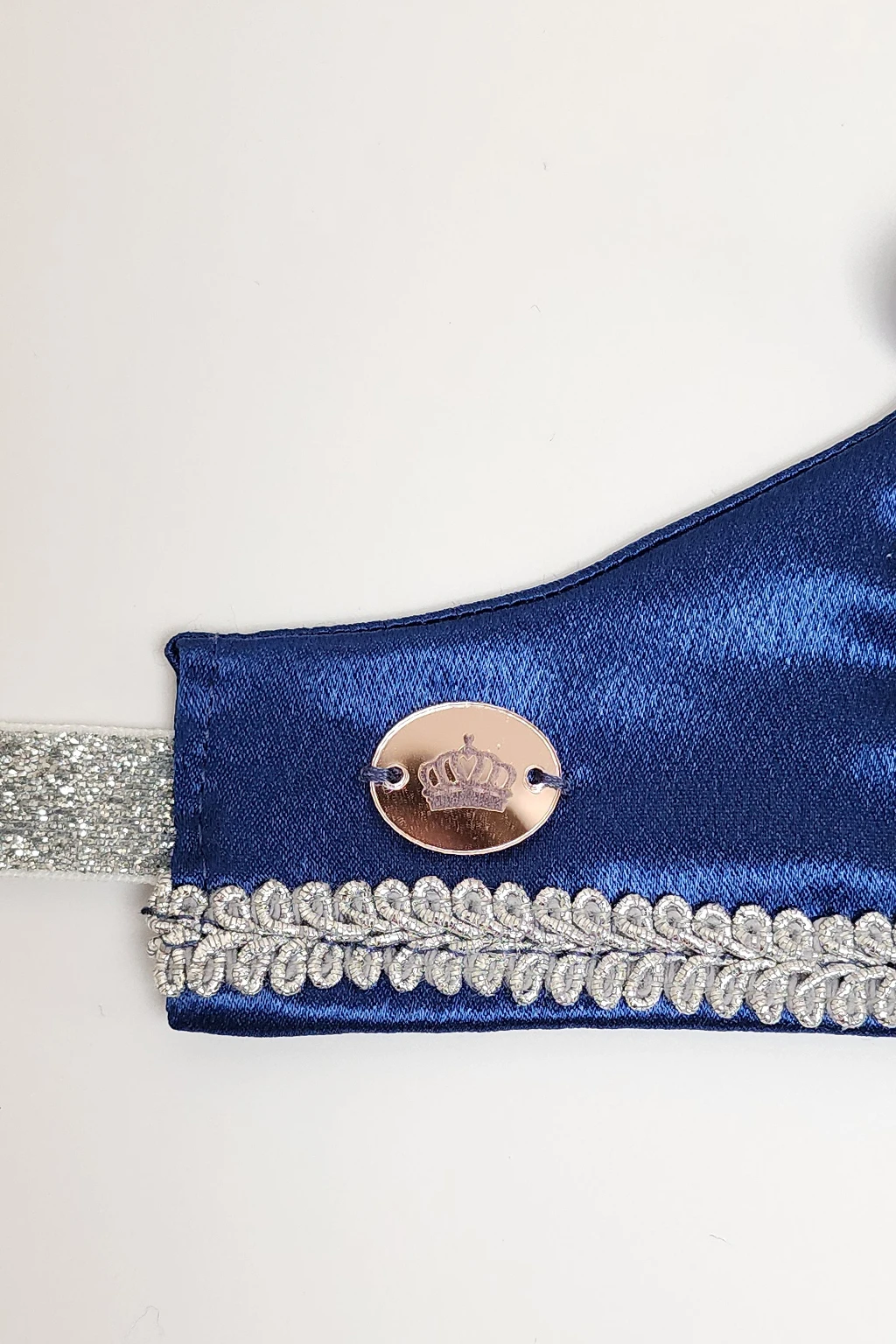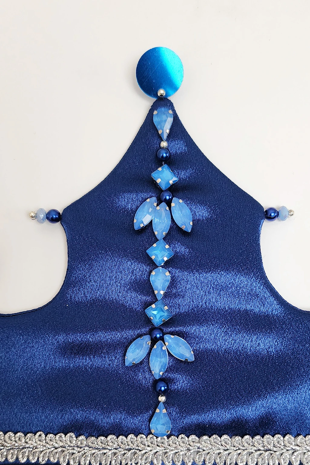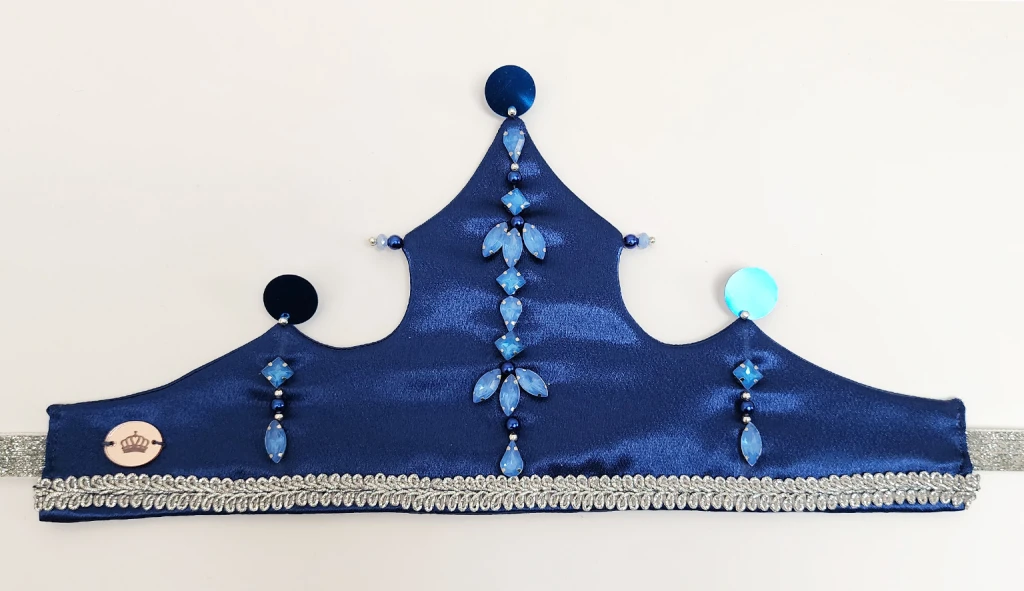 Corona realizada en creppe de seda en color azul marino con bordado artesanal de gemas engarzadas y perlas plasticas. Los picos finalizan con lentejuelas a tono.En la parte inferior posee un galon plateado en todo el largo de la corona y para finalizar en sus laterales se encuentran las dos cintas de lurex plateado que sirven para ajustar la corona a la cabeza de las princesas. En lateral se encuentra el dije de acrilico grabado con logotipo de la marca