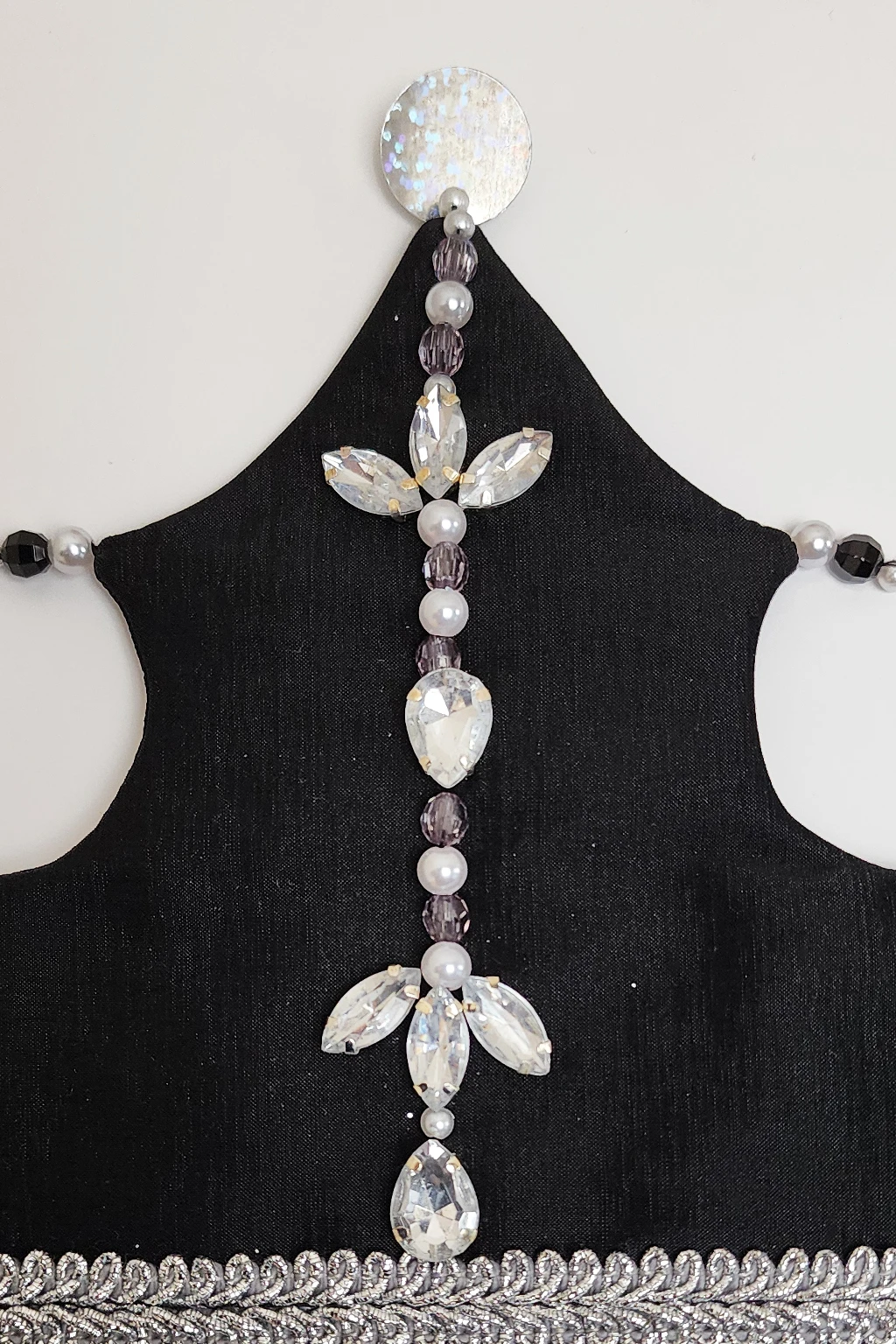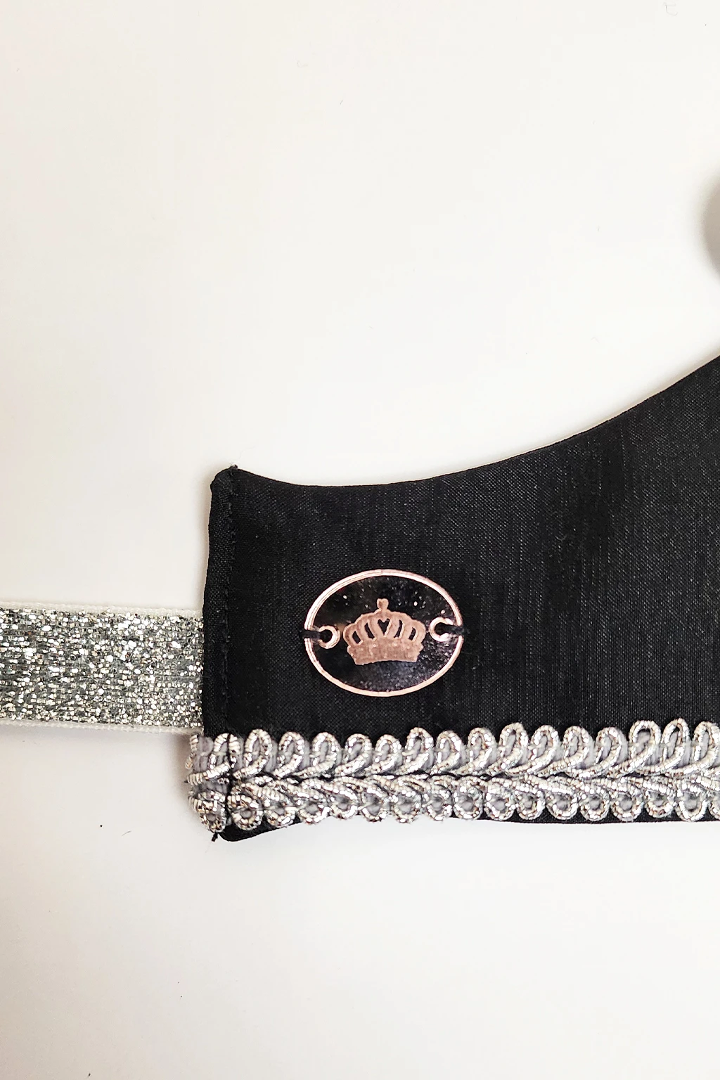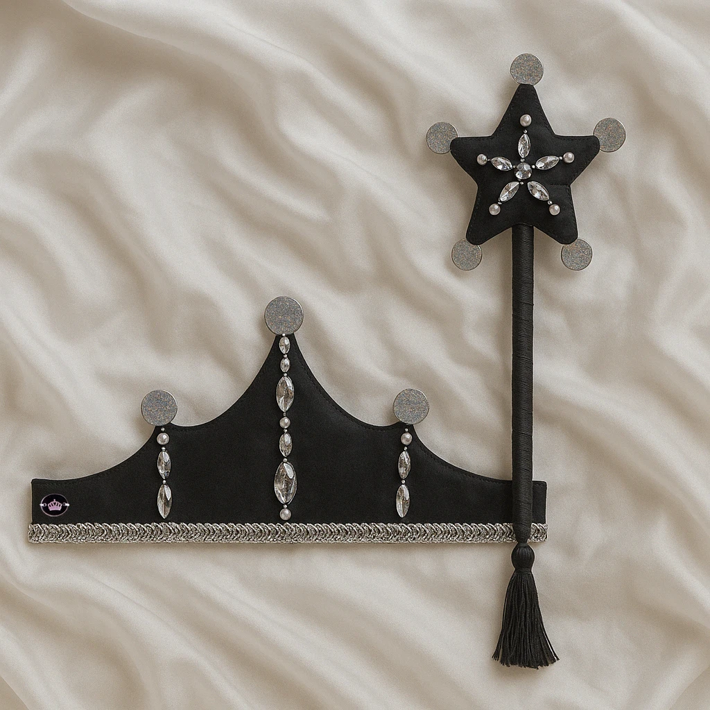 Corona realizada en creppe de seda en color negro con bordado artesanal de gemas engarzadas y perlas plasticas. Los picos finalizan con lentejuelas a tono. En la parte inferior posee un galon plateado en todo el largo de la corona y para finalizar en sus laterales se encuentran las dos cintas de lurex plateado que sirven para ajustar la corona a la cabeza de las princesas. En lateral se encuentra el dije de acrilico grabado con logotipo de la marca
