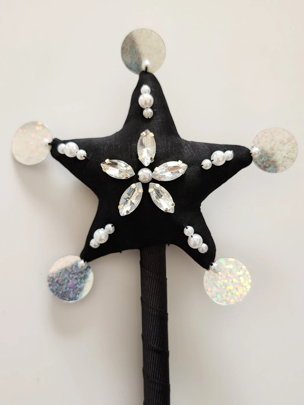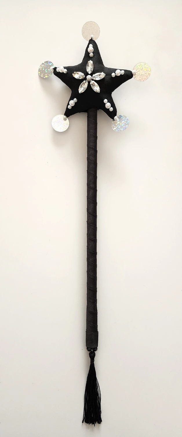 Varita realizada en creppe de seda en color negro y forma de estrella, la cual lleva bordado artesanal de gemas engarzadas y perlas plasticas. Los picos finalizan con lentejuelas a tono. En la parte posterior de la estrella se encuentra el dije de acrilico grabado con logotipo de la marca. La varilla es de madera de pino con revestimiento de cinta gross color negro. Finaliza en una borla a tono.