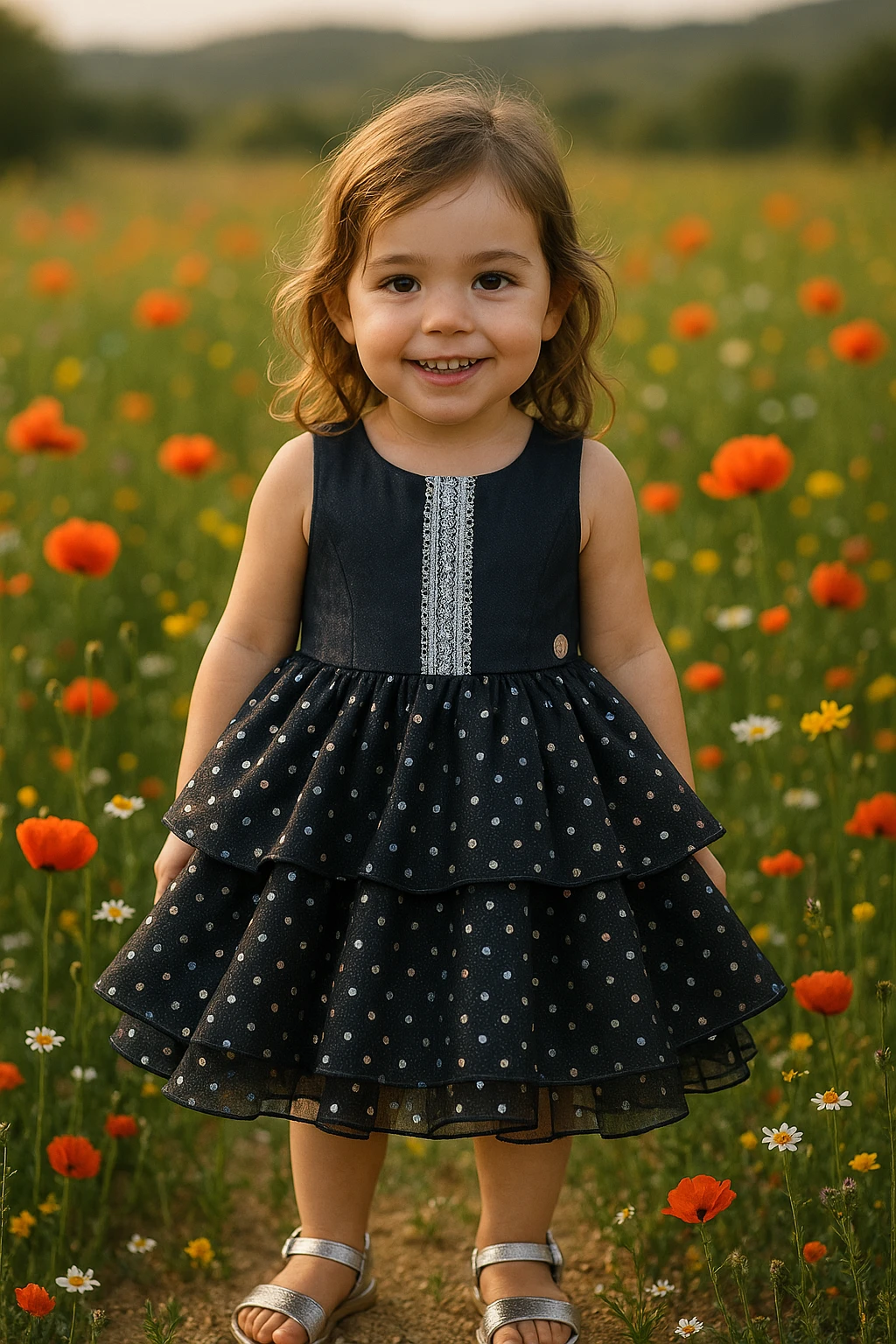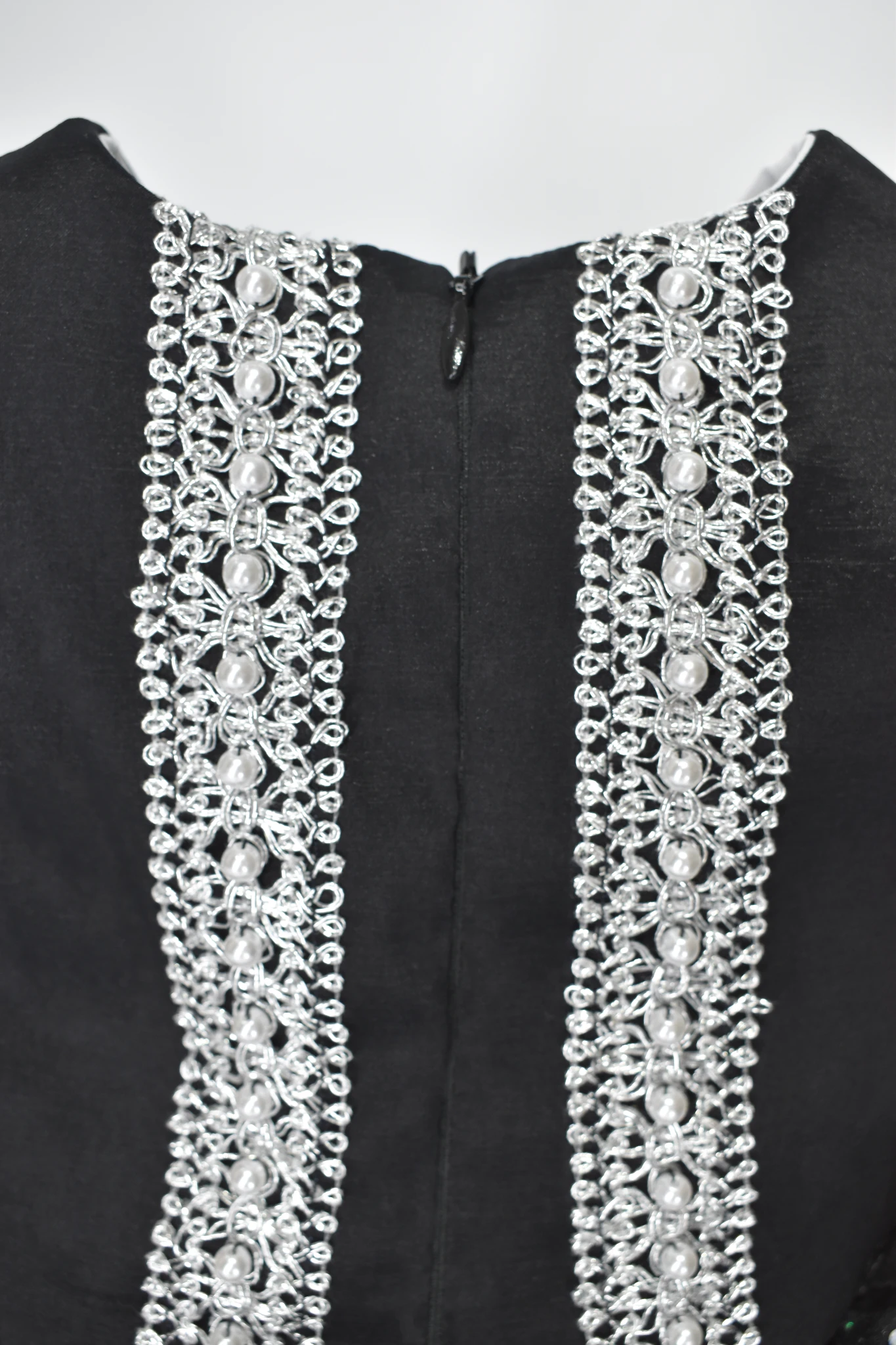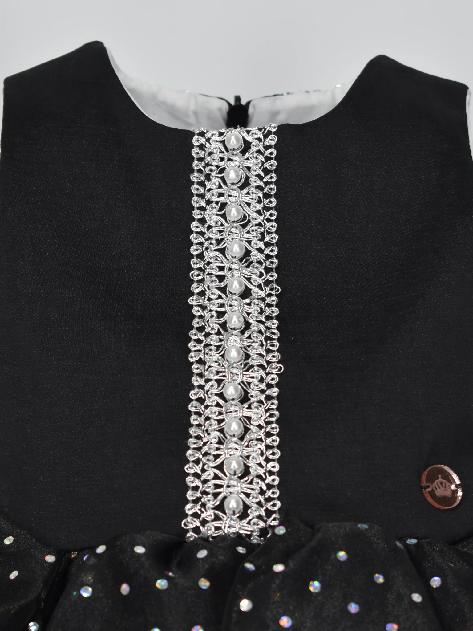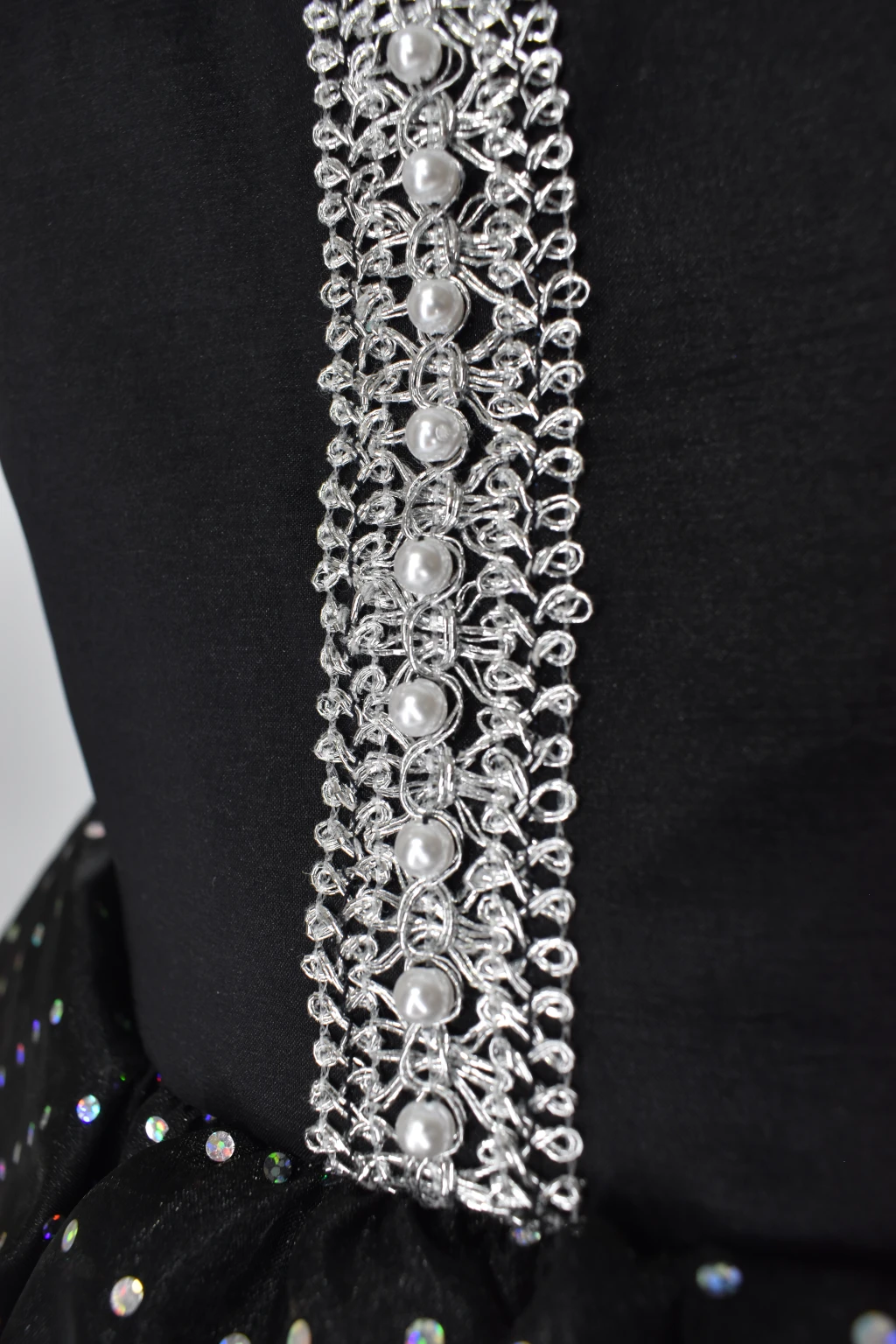 Pechera realizada en creppe de seda en color negro al cual se le superpone una cinta tejida en lurex plateado, con perlas blancas bordadas a mano. En espalda se repite a ambos lados del cierre las cintas tejidas de lurex plateado con las perlas blancas aplicadas a mano. Esta pechera esta forrada en tela 100% algodon para amabilidad con la piel de las princesas.