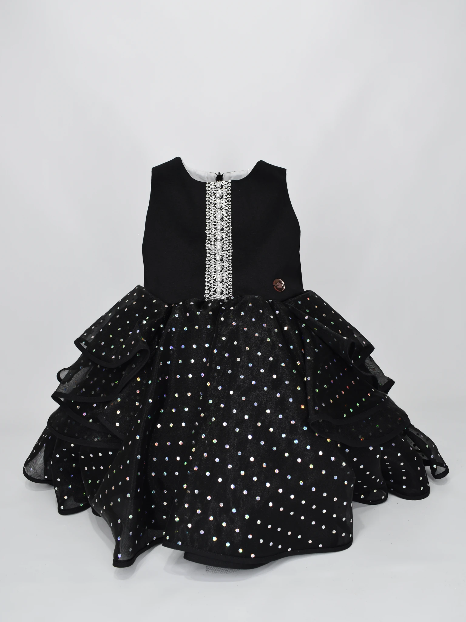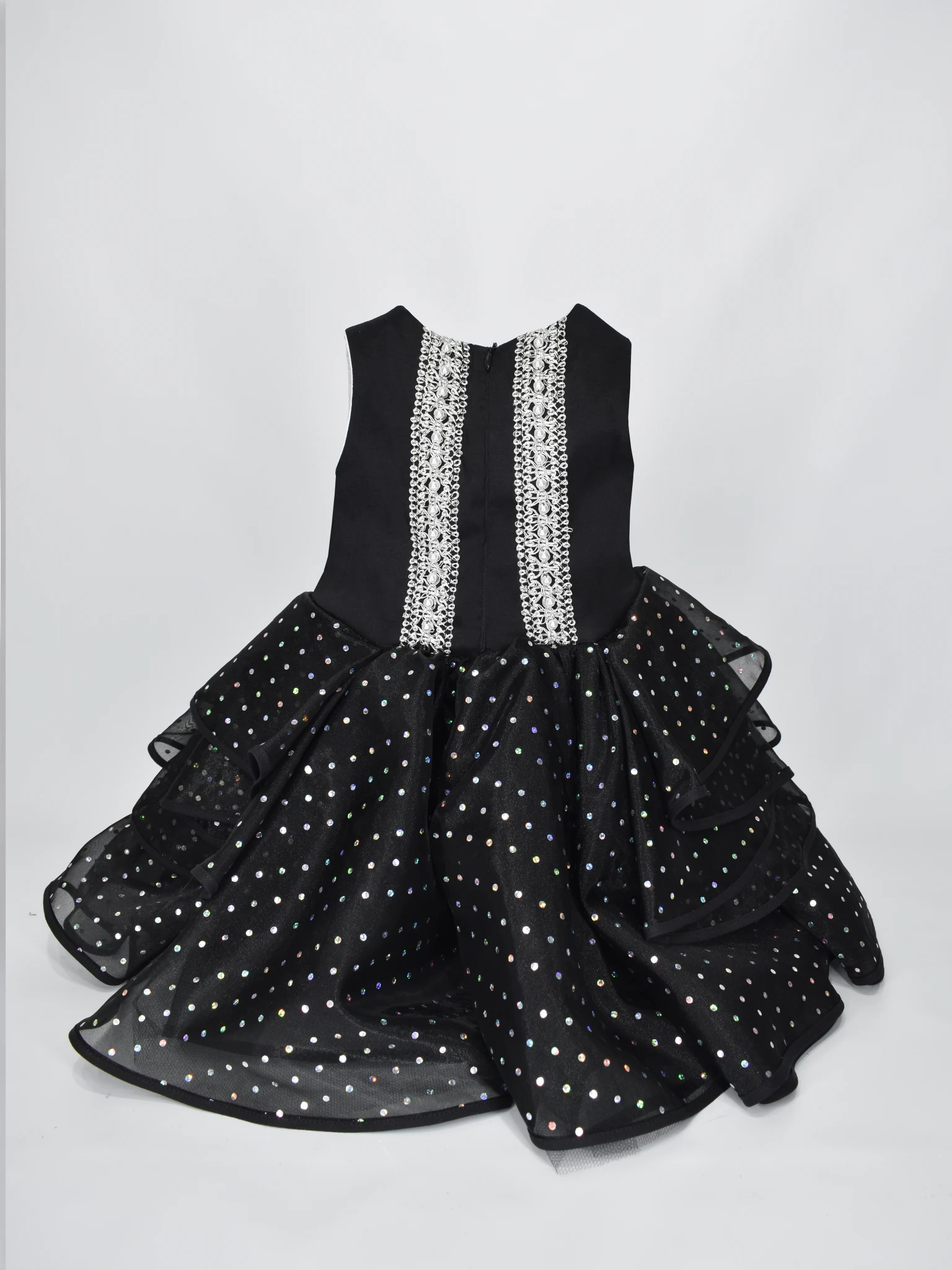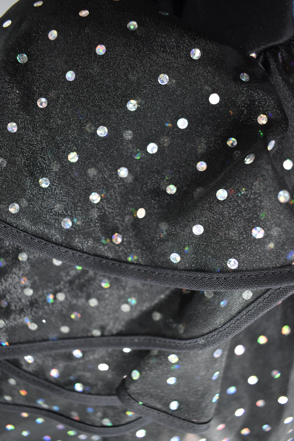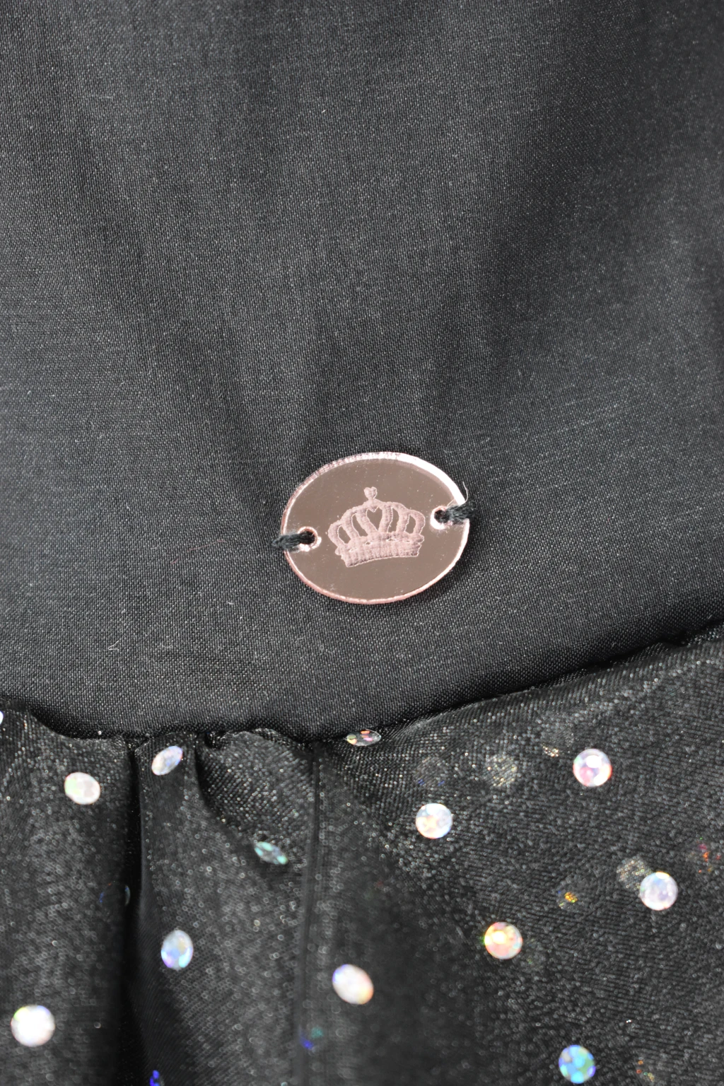 Falda compuesta por circunferencia triple plato en tul tradicional negro, por encima se coloca una circunferencia triple plato en organza negra, por encima una circunferencia triple plato en tul tradicional negro y finaliza con una circunferencia triple plato en organza negra con motas holograficas.